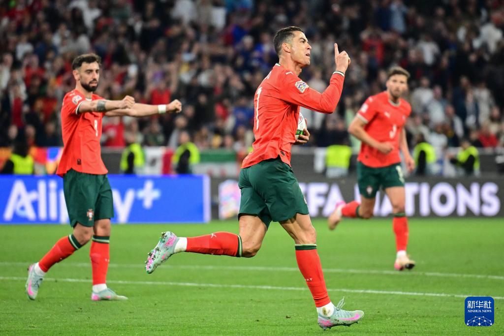 6月8日,葡萄牙队球员克里斯蒂亚诺·罗纳尔多(前)在比赛中庆祝进球。