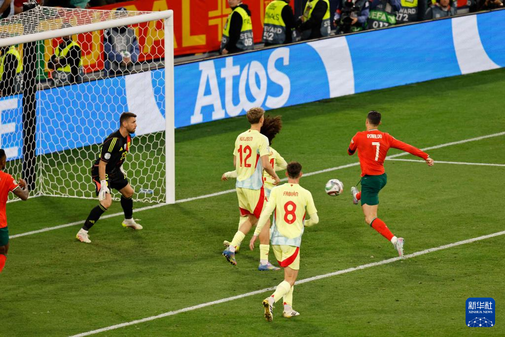 6月8日,葡萄牙队球员克里斯蒂亚诺·罗纳尔多(右一)在比赛中射门得分。