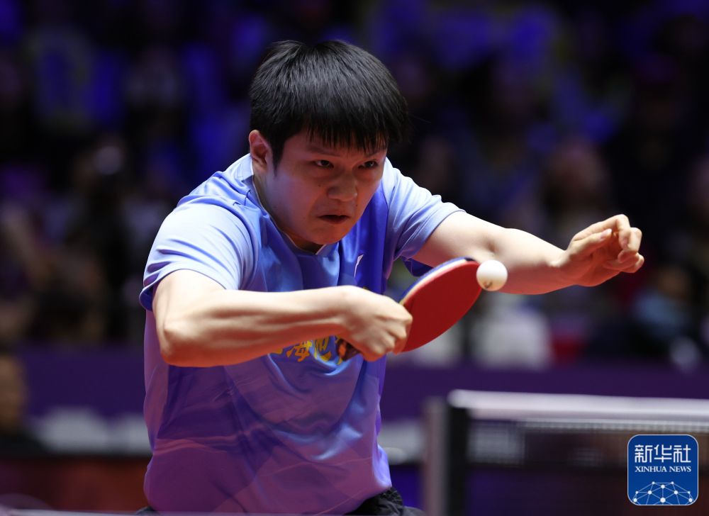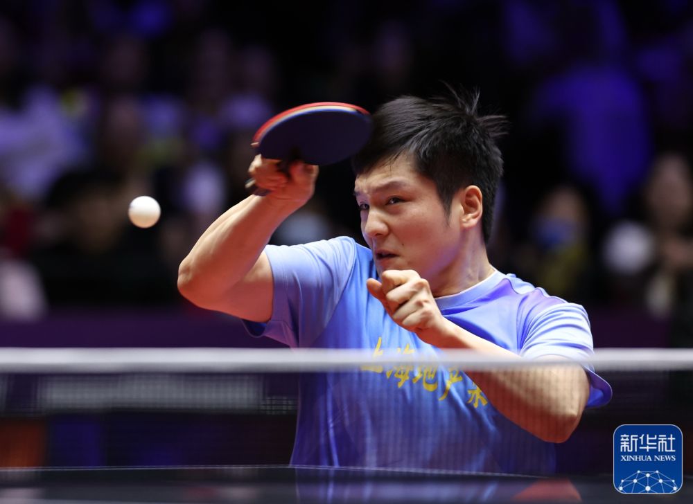 ↑樊振东在比赛中。