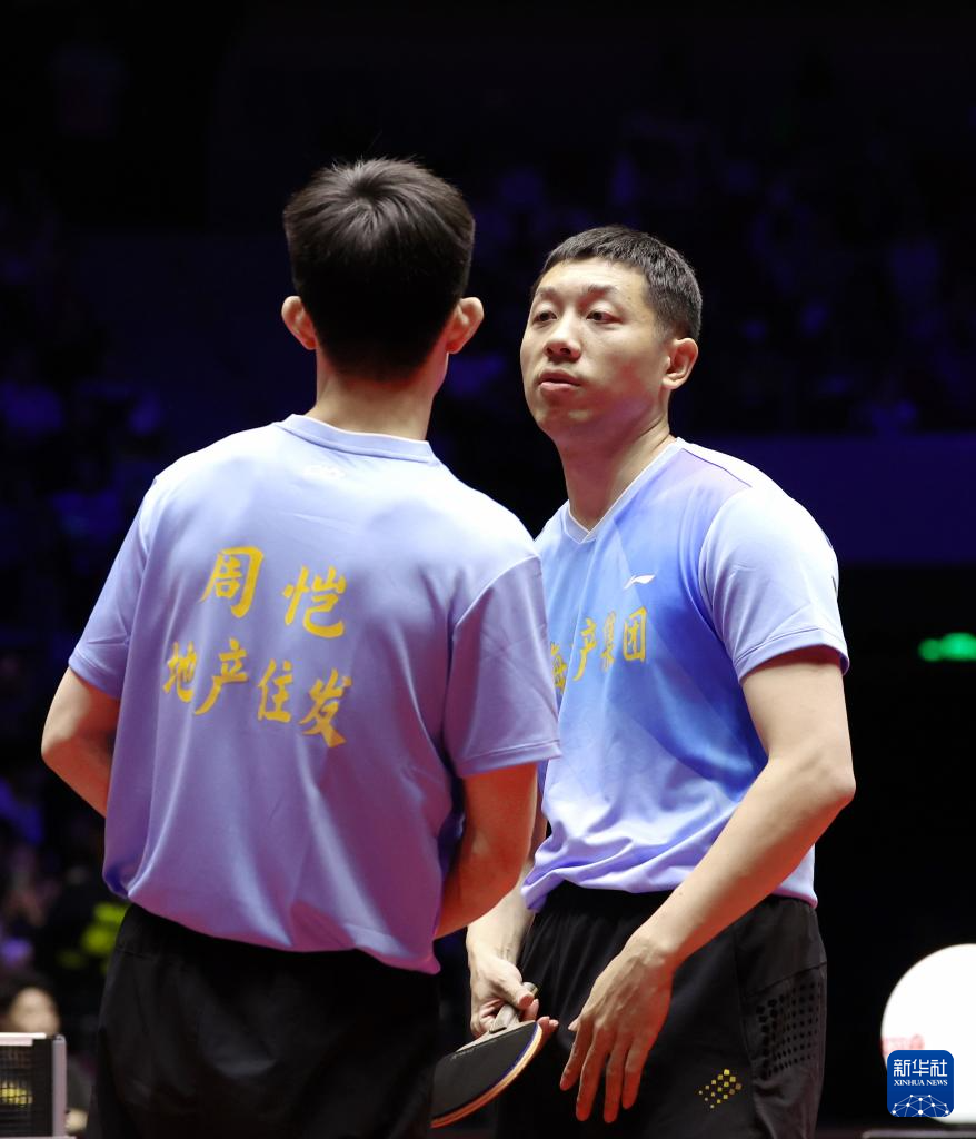 6月9日,上海地产集团队组合许昕(右)/周恺在比赛中。他们在双打比赛中2比3不敌山东鲁能队组合闫安/袁励岑。