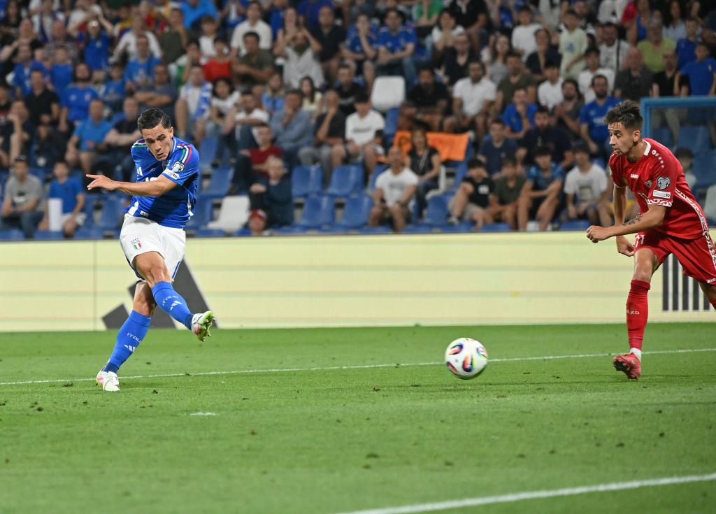 6月9日,意大利队球员拉斯帕多里(左)在比赛中射门得分。新华社发(阿尔贝托·林格利亚摄)