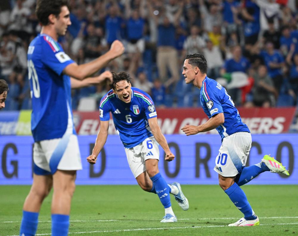 6月9日,意大利队球员拉斯帕多里(右)庆祝进球。新华社发(阿尔贝托·林格利亚摄)