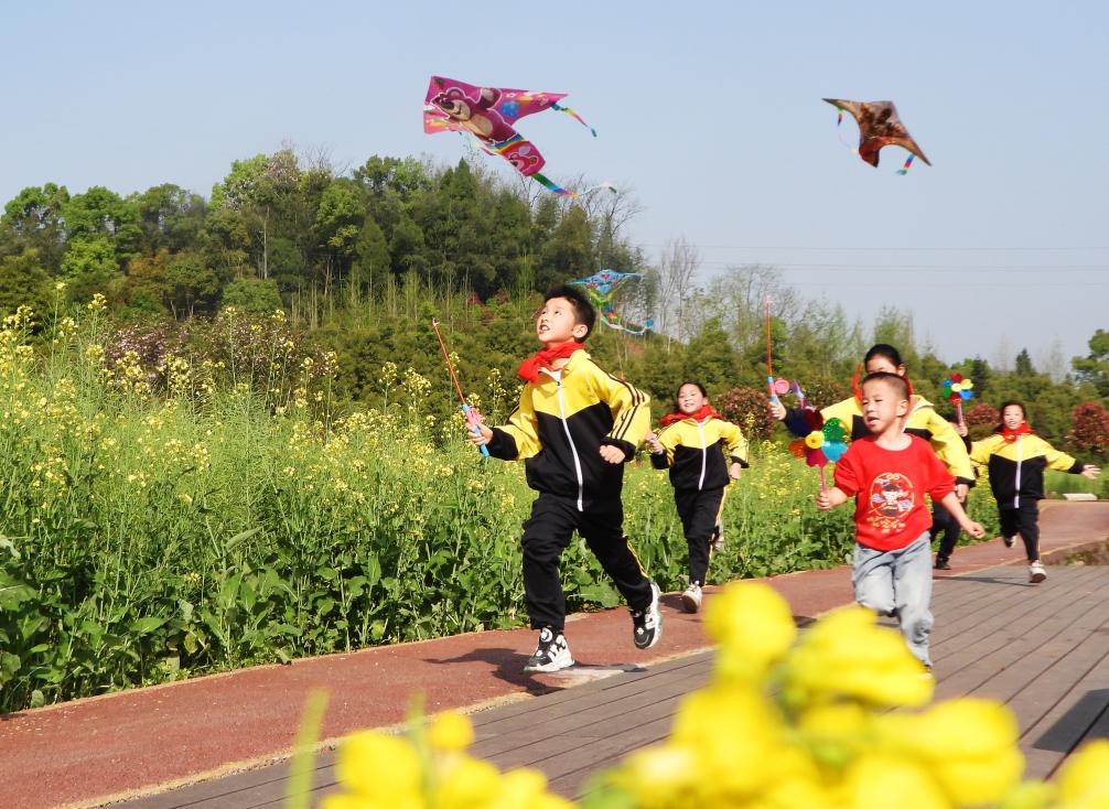 4月8日,学生在四川省达州市大竹县月华镇河心村油菜花田里放风筝。 新华社发(邓良奎摄)