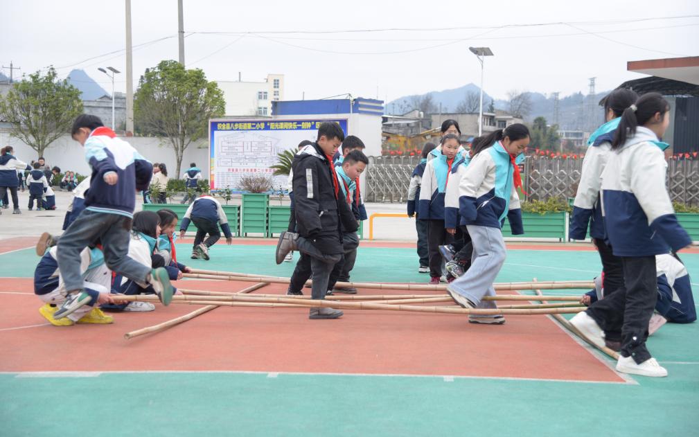 2月26日,贵州省毕节市织金县八步街道第二小学的学生在大课间跳竹竿舞。 新华社记者 郑明鸿 摄