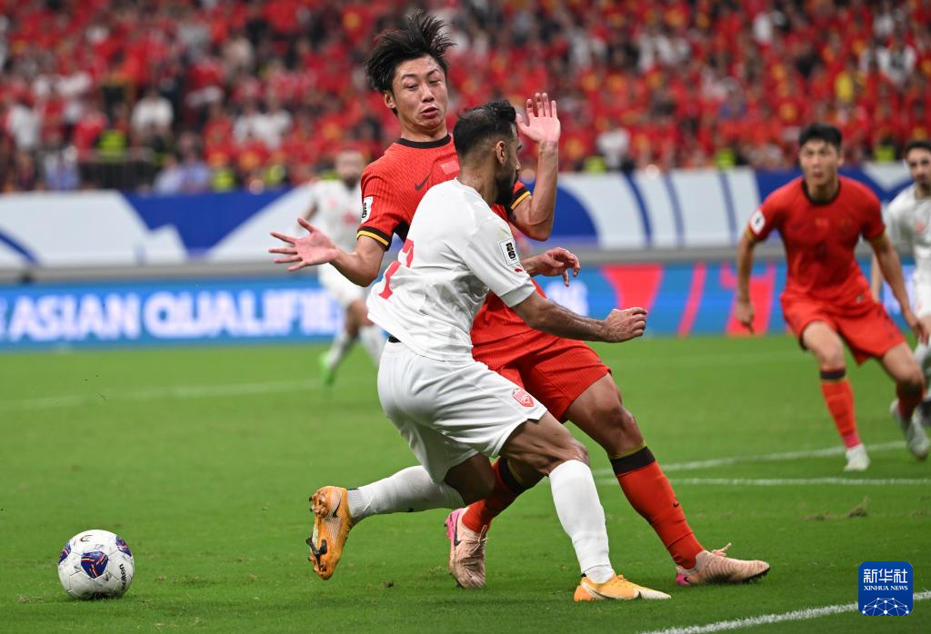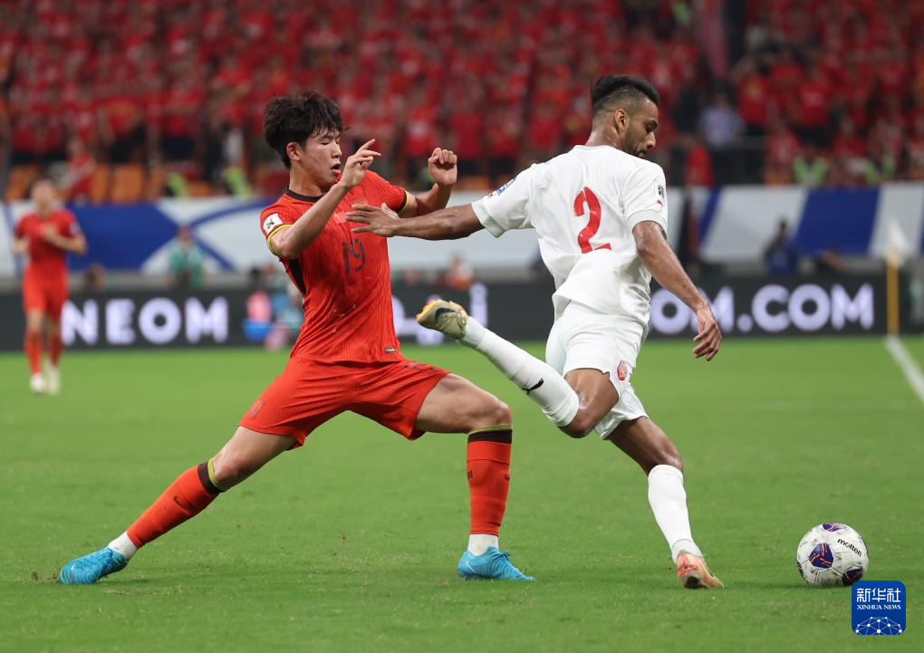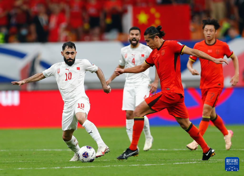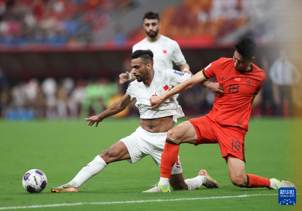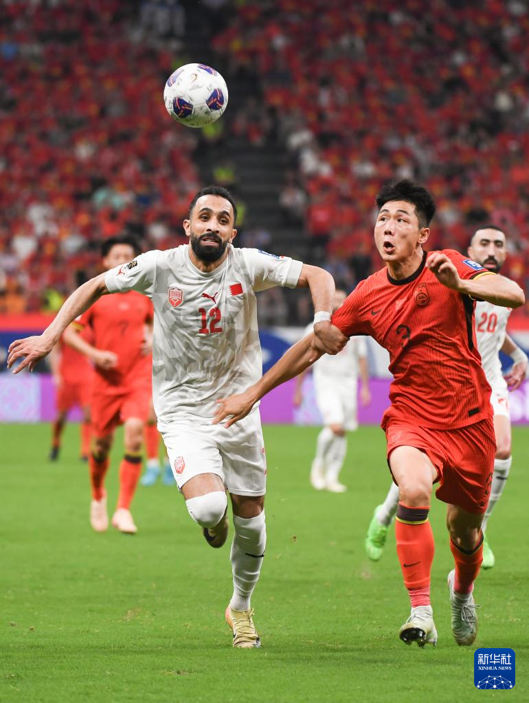 6月10日,中国队球员林良铭(右)在比赛中与巴林队球员马赫迪·胡迈丹拼抢。