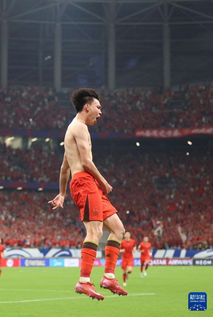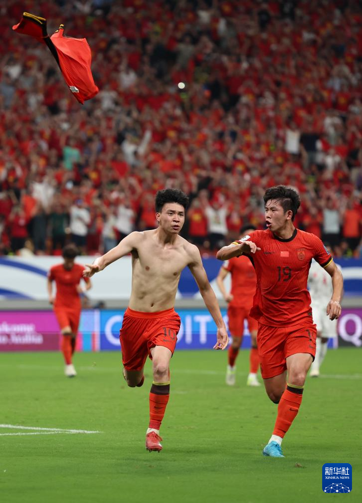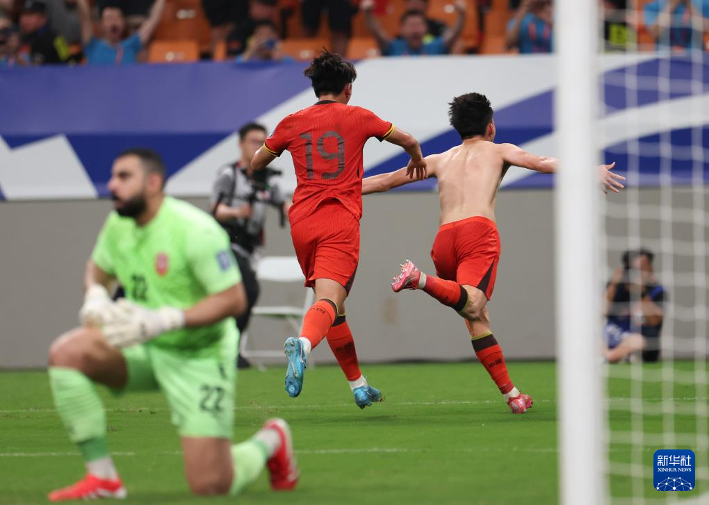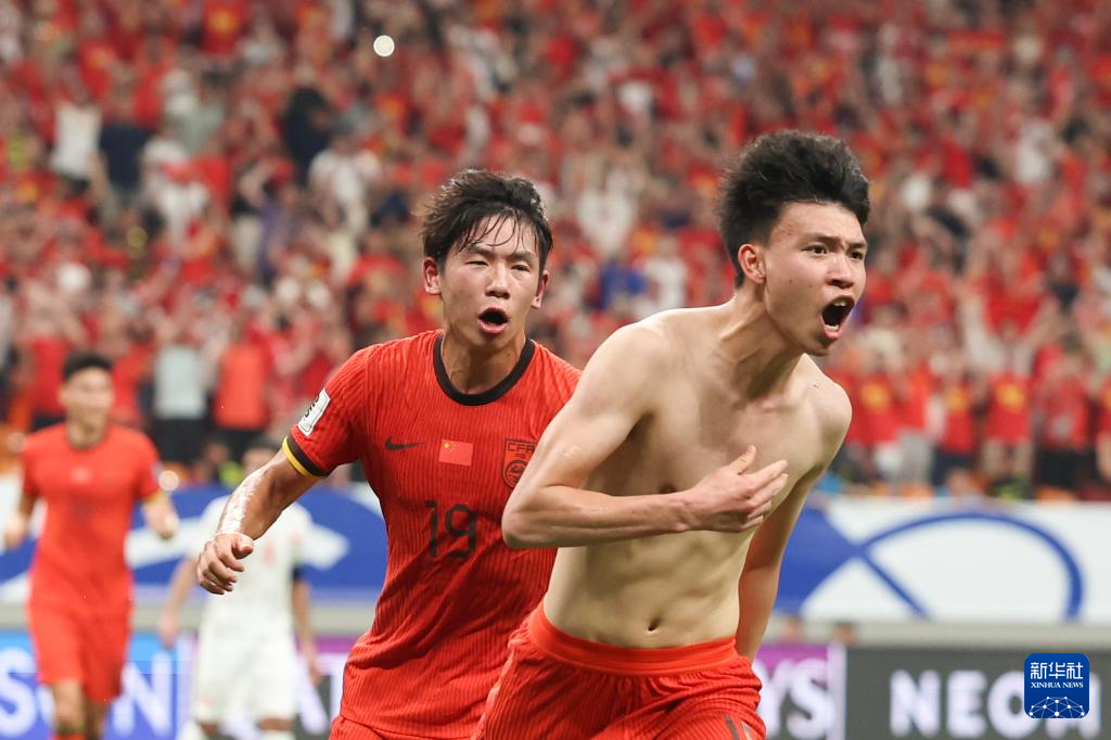 6月10日,中国队球员王钰栋(右)在进球后展示球衣。