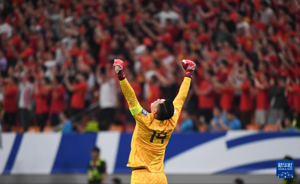 6月10日,中国队守门员王大雷赛后庆祝胜利。