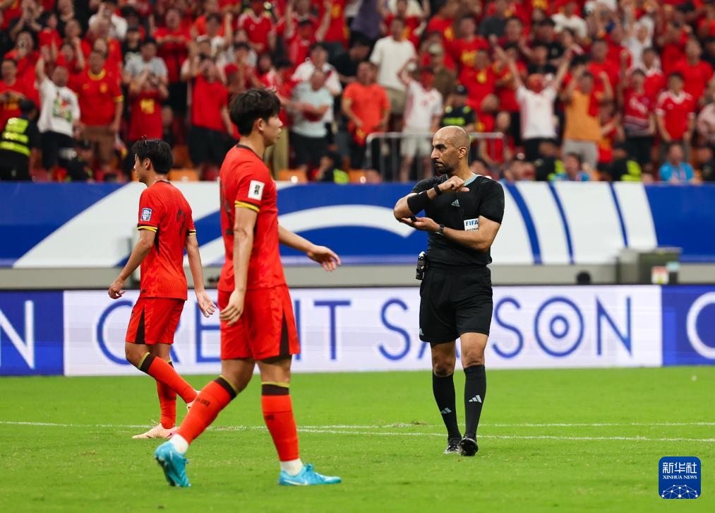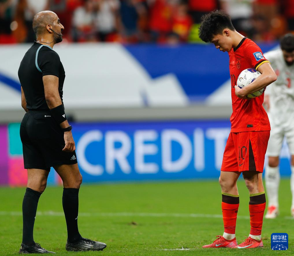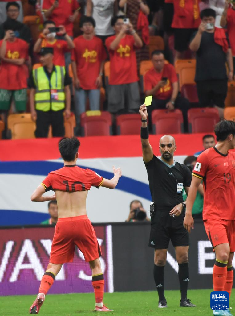 6月10日,主裁判阿德尔·阿里·纳克比(中)向中国队球员王钰栋(左)出示黄牌。