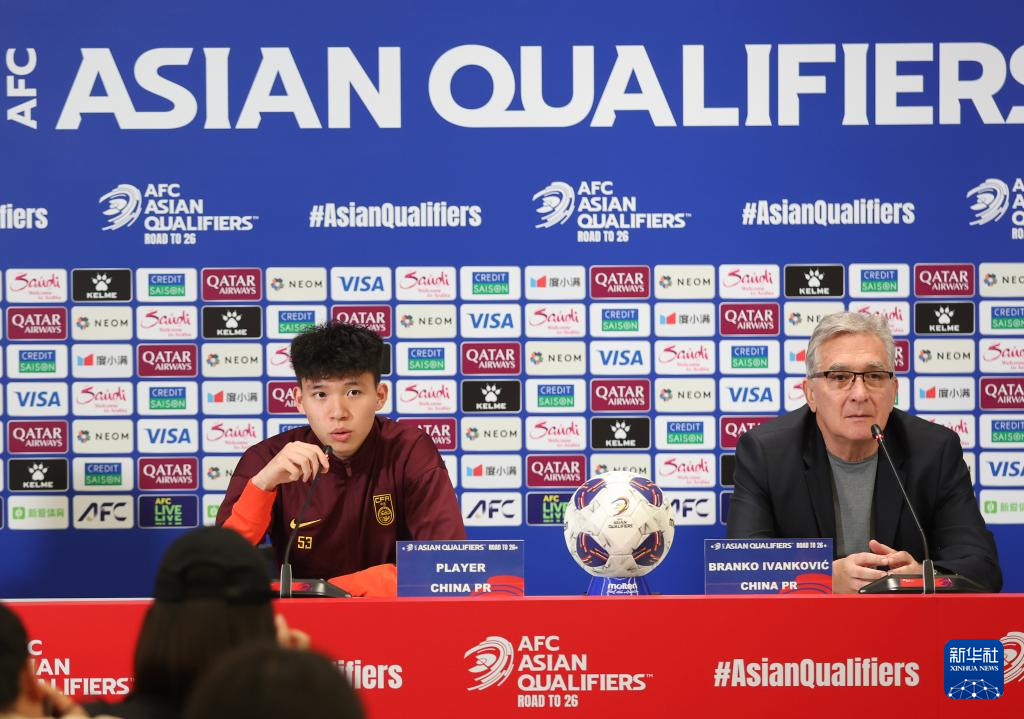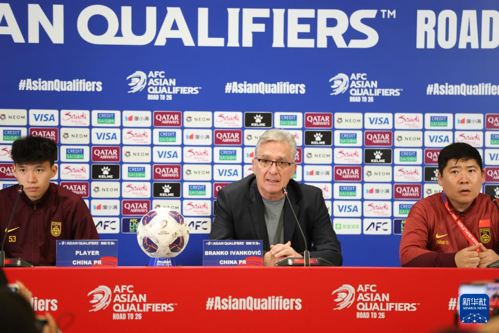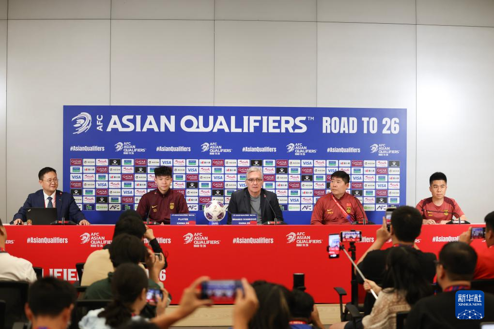 6月10日,中国队主教练伊万科维奇(中)在赛后新闻发布会上。