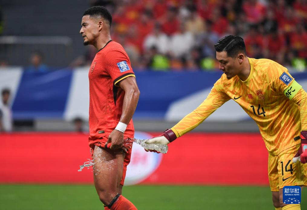 6月10日,中国队守门员王大雷(右)和队友蒋光太在比赛间隙。