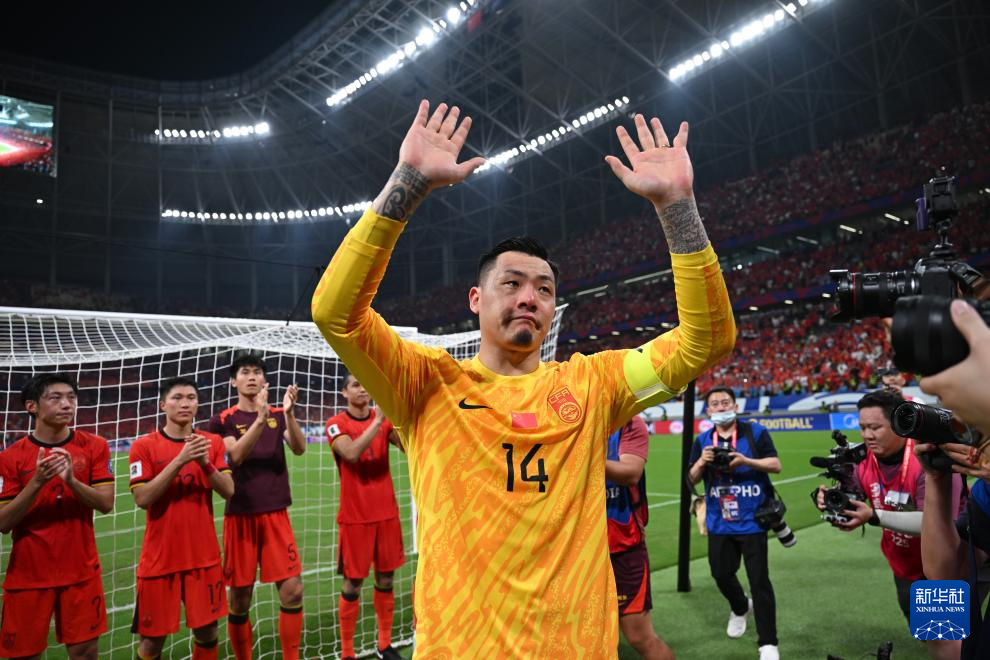 6月10日,中国队守门员王大雷(前)在比赛后向球迷致意。