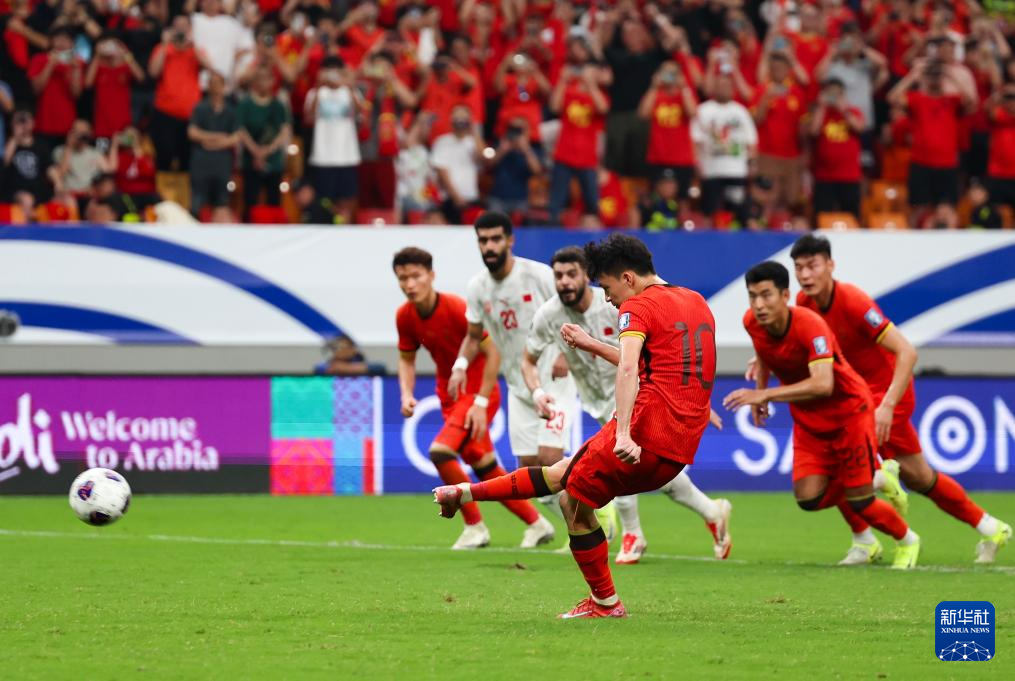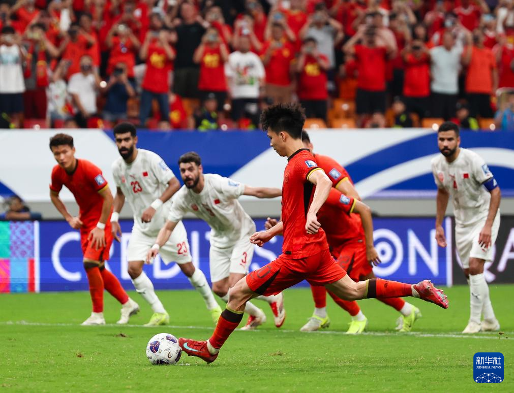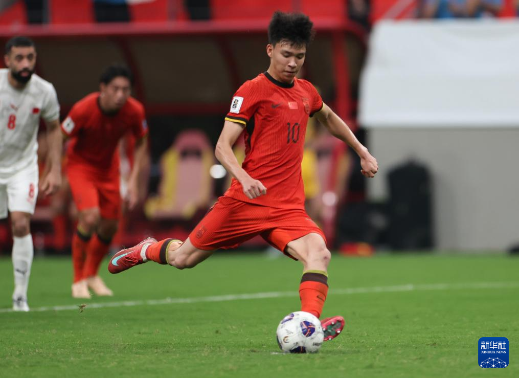 6月10日,中国队球员王钰栋在比赛中主罚点球。