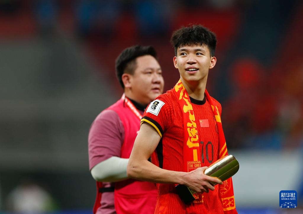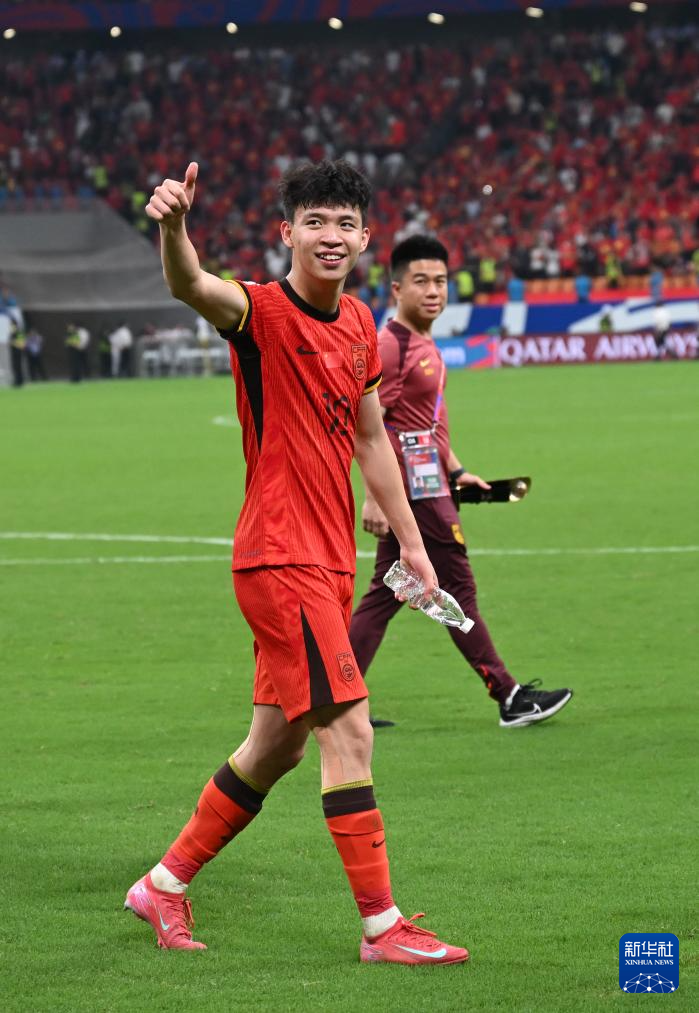 6月10日,中国队球员王钰栋在比赛后向球迷致意。