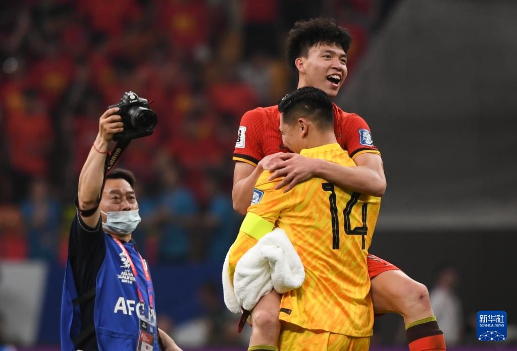 6月10日,中国队球员王钰栋(右上)和队友王大雷在比赛后庆祝胜利。