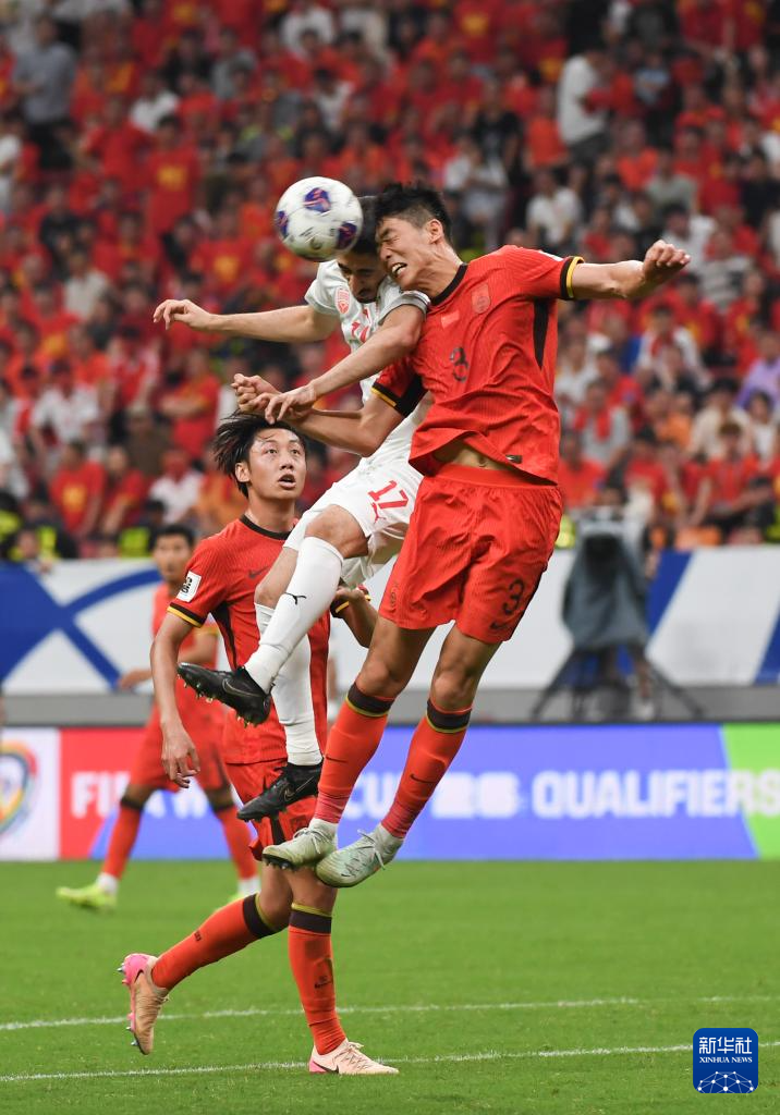 6月10日,中国队球员魏震(上右)和巴林队球员侯赛因·阿卜杜勒卡里姆·阿卜杜勒阿齐兹(上左)在比赛中争顶。