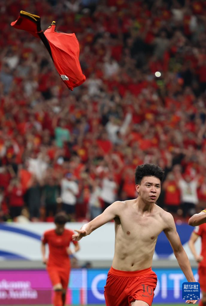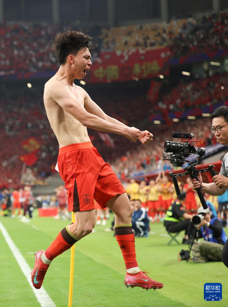 6月10日,中国队球员王钰栋在进球后展示球衣。