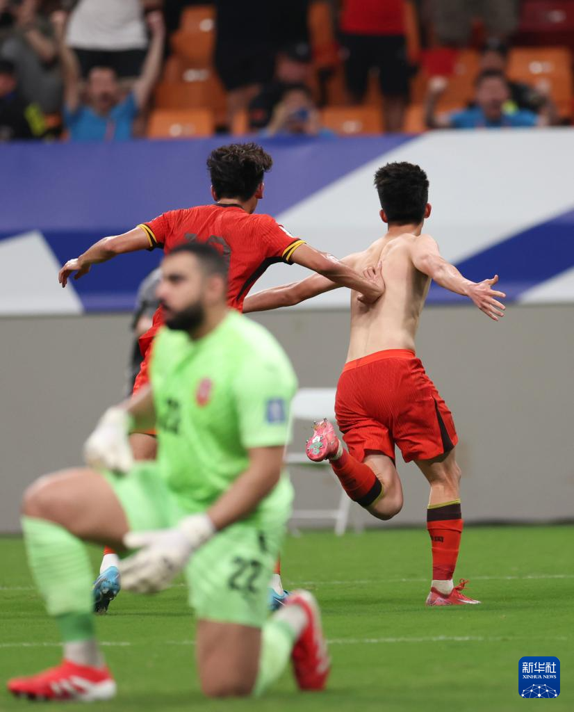 6月10日,中国队球员王钰栋(左)罚进点球后庆祝。