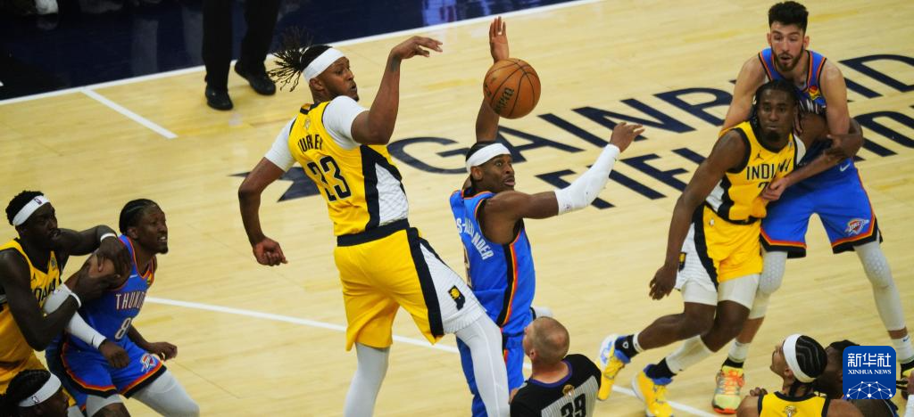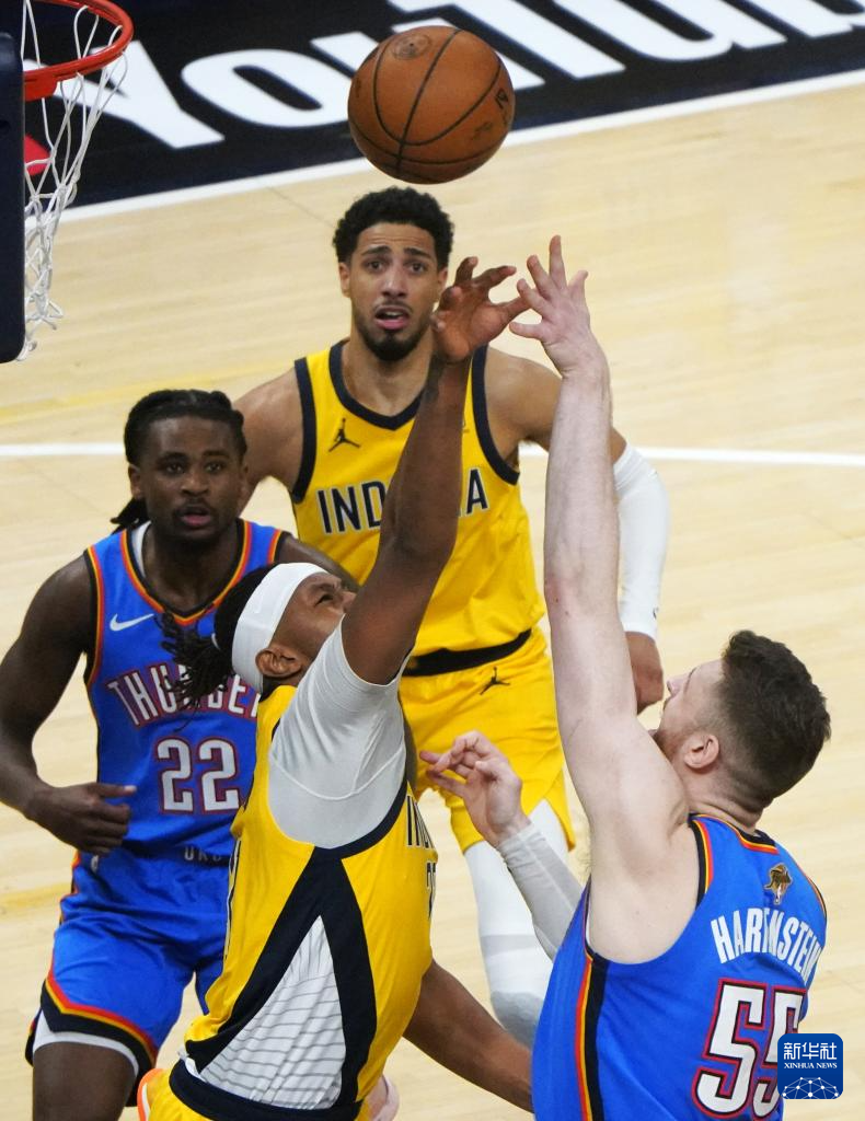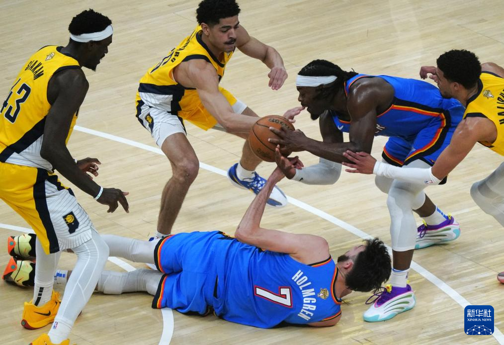 6月11日,步行者队球员迈尔斯·特纳(左三)与雷霆队球员谢伊·吉尔杰斯-亚历山大在比赛中拼抢。