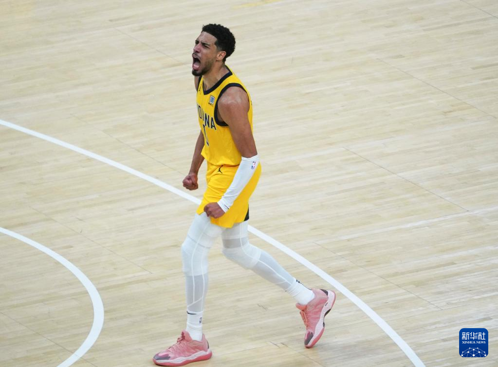 6月11日,步行者队球员哈里伯顿在比赛中庆祝。