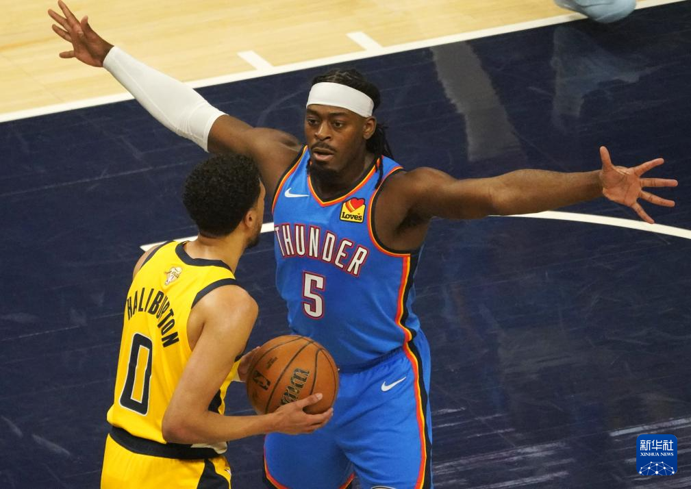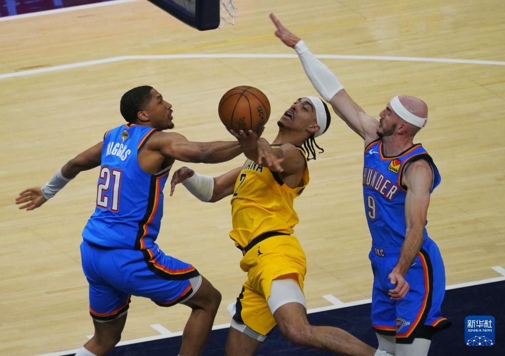 6月11日,雷霆队球员吕盖兹·多尔特(右)在比赛中防守步行者队球员哈里伯顿。