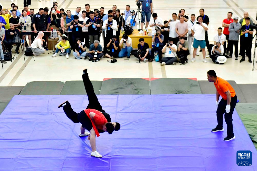6月12日,来自中国陈家沟太极拳辅导站代表队的杨奉豪(左)与印度尼西亚代表队的戈拉尼布拉纳在竞技推手比赛中。