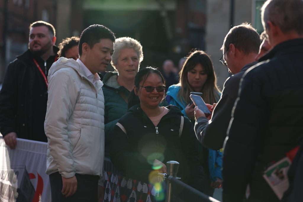 4月22日,丁俊晖(前左)在2025年斯诺克世锦赛首轮比赛后与球迷在一起。新华社发(翟政 摄)