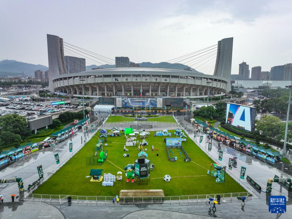 这是6月14日拍摄的位于浙江省黄龙体育中心东广场的浙江俱乐部足球嘉年华活动现场(无人机照片)。
