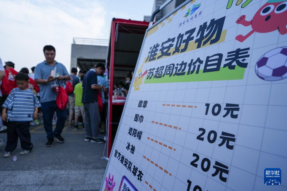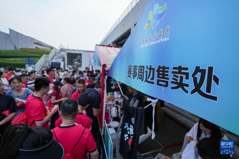 6月14日,球迷在江苏淮安“苏超”市集选购各类赛事周边产品。