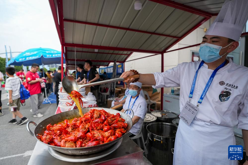 6月14日,一名厨师在江苏淮安“苏超”市集制作小龙虾。