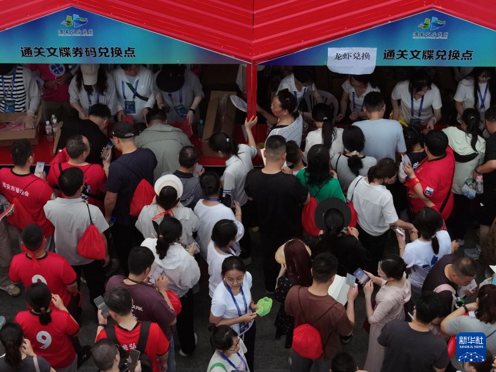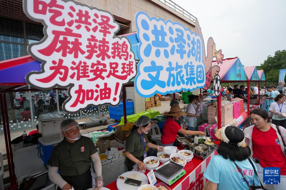 6月14日,球迷来到江苏淮安“苏超”市集,准备选购各类美食特产。