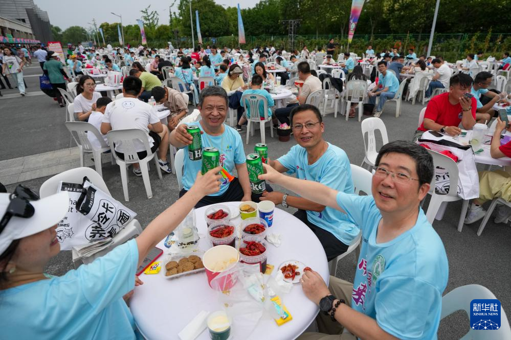 6月14日,球迷在江苏淮安“苏超”市集品尝美食特产。