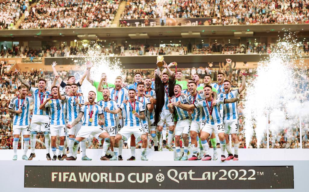 2022年12月18日,阿根廷队球员在颁奖仪式上庆祝。当日,在卡塔尔卢赛尔球场进行的2022卡塔尔世界杯足球赛决赛中,阿根廷队与法国队在常规时间和加时赛战成3比3平,通过点球大战阿根廷队以总比分7比5获胜,夺得冠军。新华社记者 李明 摄