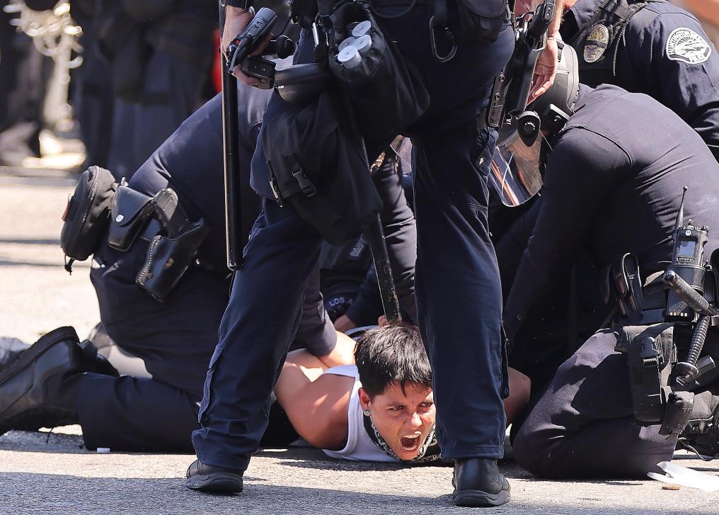 6月8日,在美国加利福尼亚州洛杉矶市中心的联邦执法机构门前,一名抗议者被警察控制。新华社发(邱晨摄)