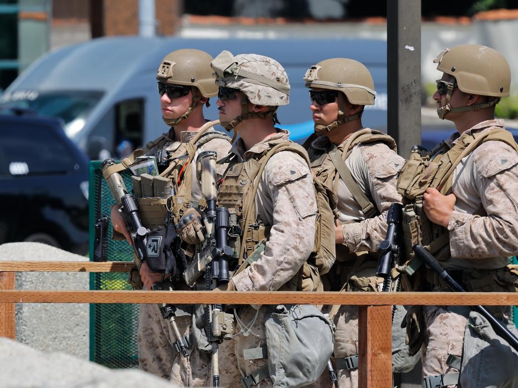 6月13日,美国海军陆战队士兵在洛杉矶威尔希尔联邦大楼的入口处站岗。新华社发(邱晨摄)