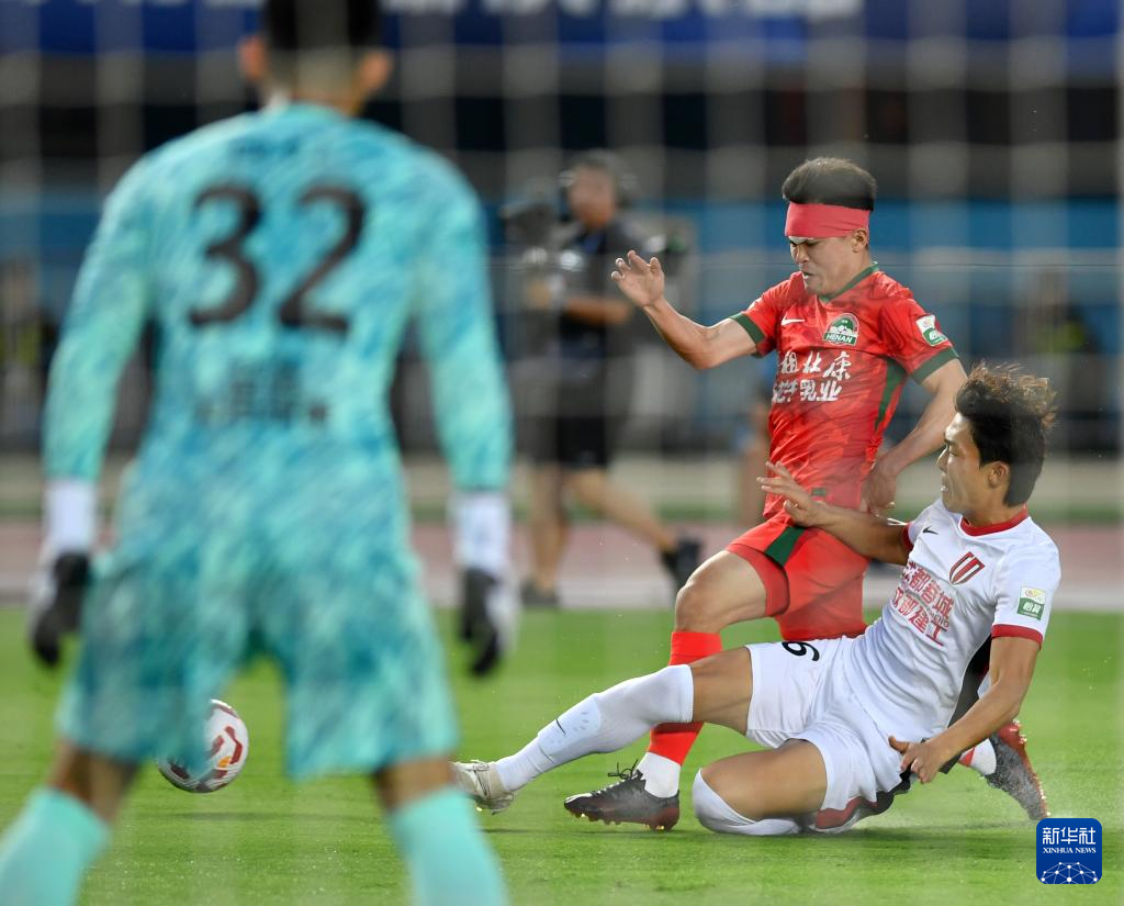 6月14日,河南俱乐部酒祖杜康队球员杨意林(右)与成都蓉城队门将刘殿座在比赛中拼抢。