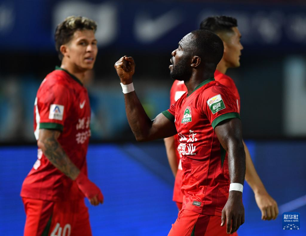 6月14日,河南俱乐部酒祖杜康队球员阿奇姆彭(前)在比赛中庆祝进球。