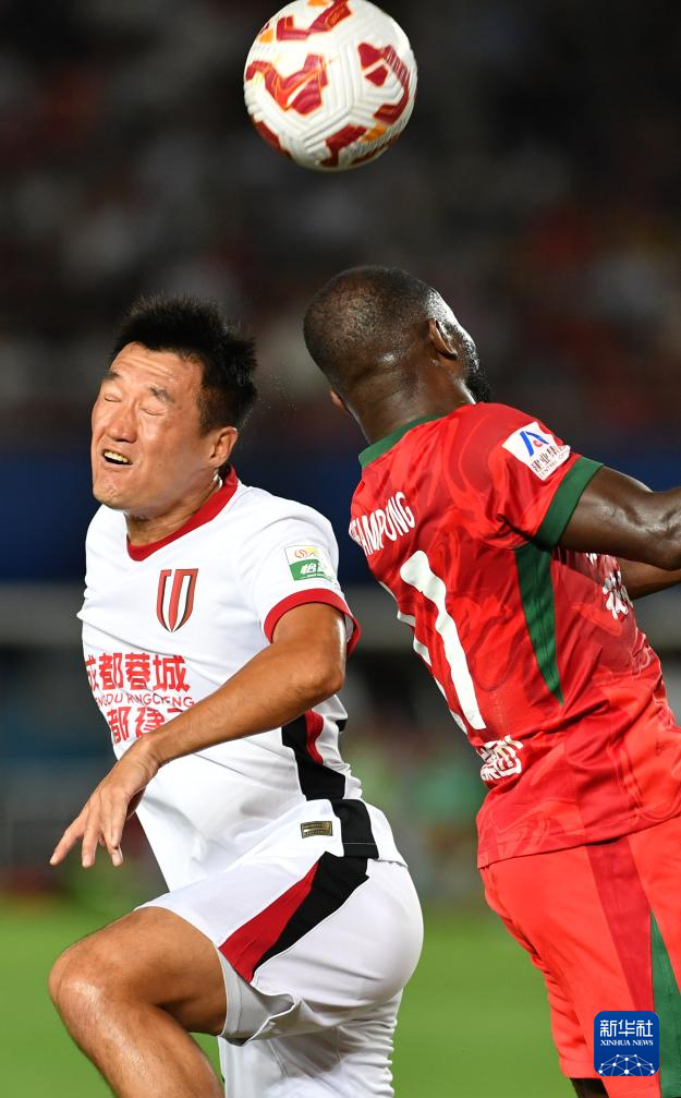 6月14日,成都蓉城队球员唐淼(左)与河南俱乐部酒祖杜康队球员阿奇姆彭在比赛中争抢头球。