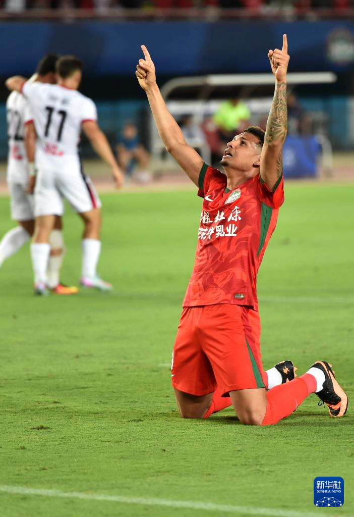 6月14日,河南俱乐部酒祖杜康队球员费利佩·卡多索在比赛中庆祝进球。