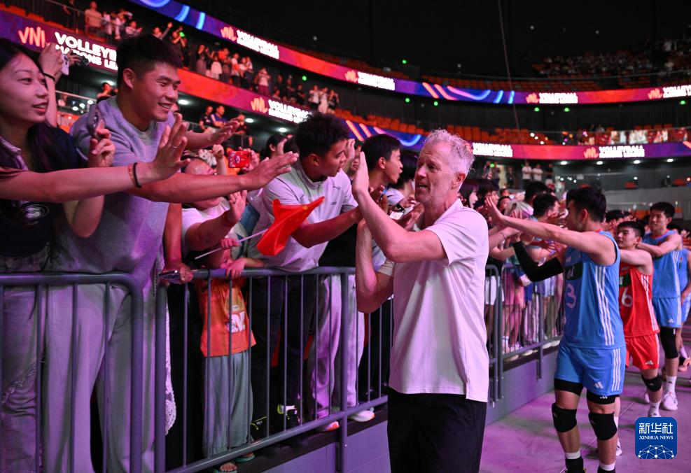 6月14日,中国队主教练维塔尔·海宁(前)在比赛后与球迷互动。