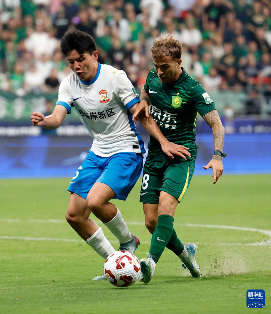 6月17日,北京国安队球员贡萨洛(右)与青岛西海岸队球员徐彬在比赛中拼抢。