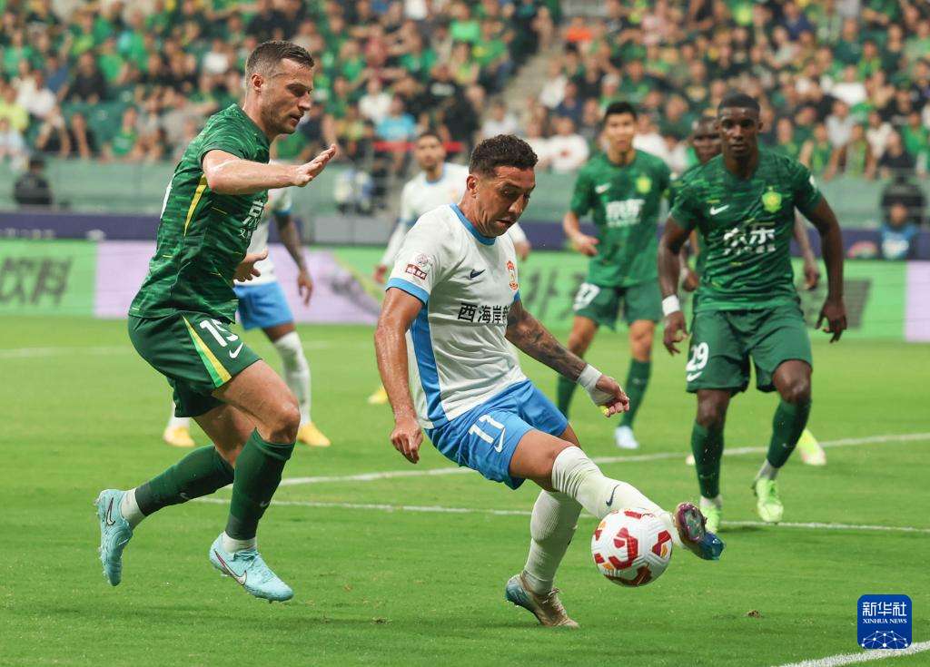 6月17日,北京国安队球员斯帕吉奇(前左)与青岛西海岸队球员戴维森(前右)在比赛中拼抢。