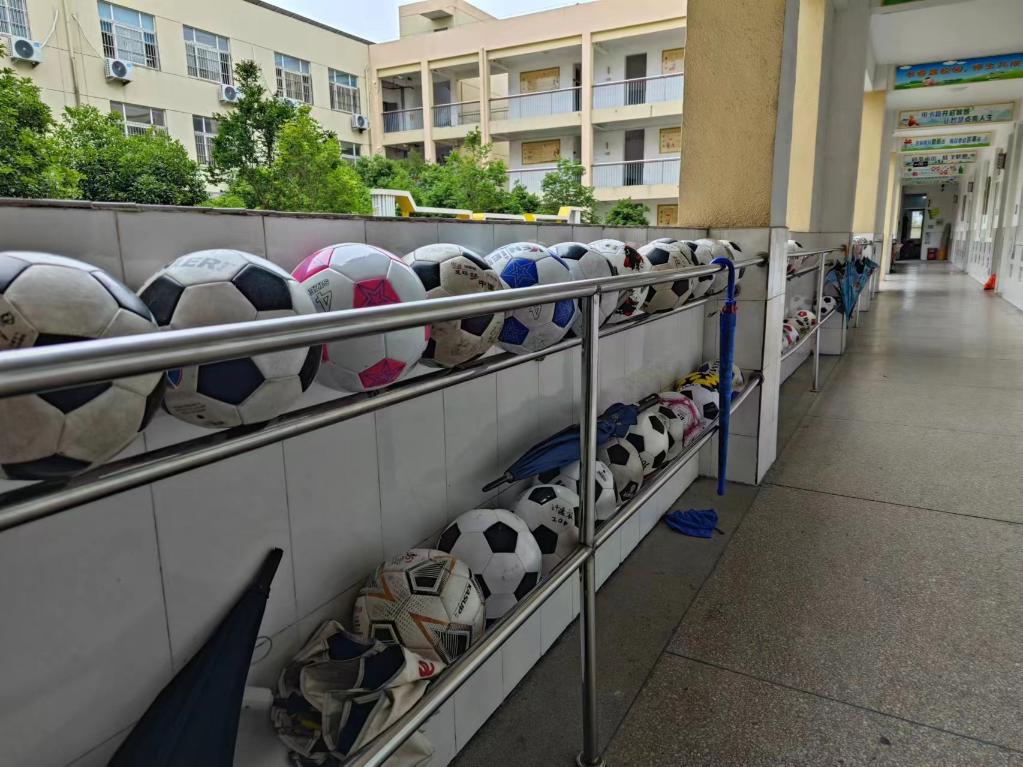 教学楼走廊上摆满了足球