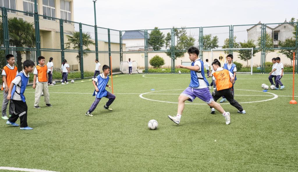 王瑜(中间踢球者)和同学们正在练球