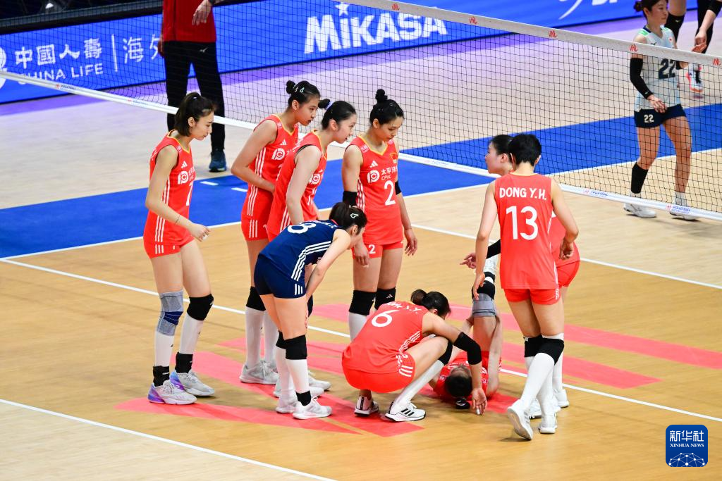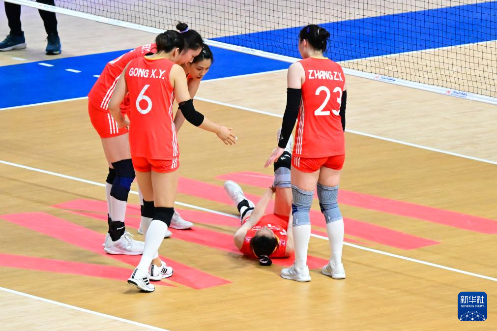 6月21日,中国队球员查看队友吴梦洁(下)伤情。