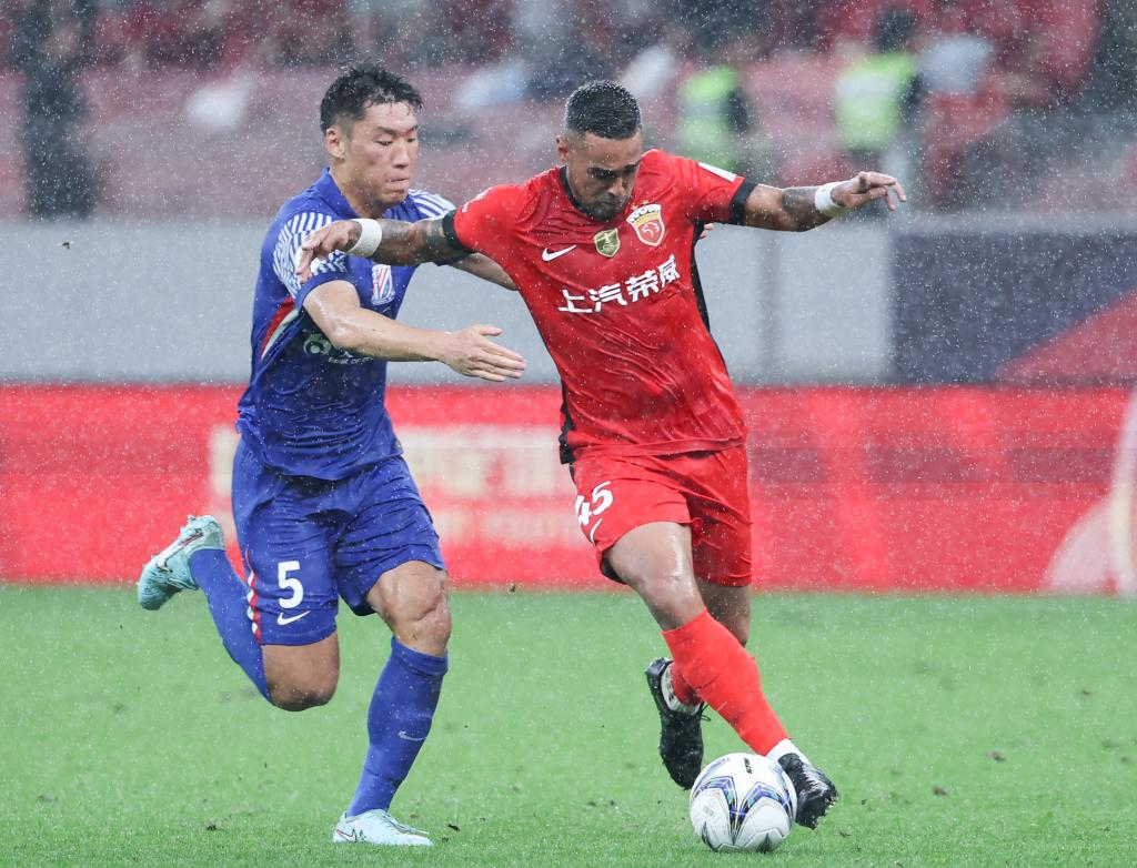 6月22日,上海海港队球员莱昂纳多(右)与上海申花队球员朱辰杰在比赛中拼抢。