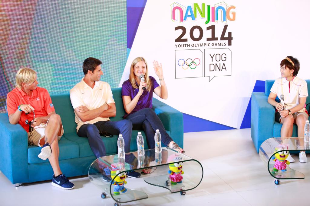 ↑2014年8月25日,考文垂(右二)在南京青奥会的活动中发言。 新华社记者 任正来 摄