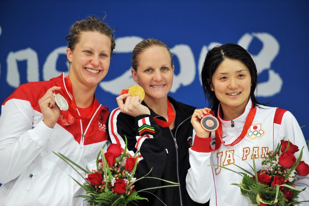 ↑2008年8月16日,考文垂(中)在“水立方”获得北京奥运会女子200米仰泳冠军。新华社记者 王定昶 摄