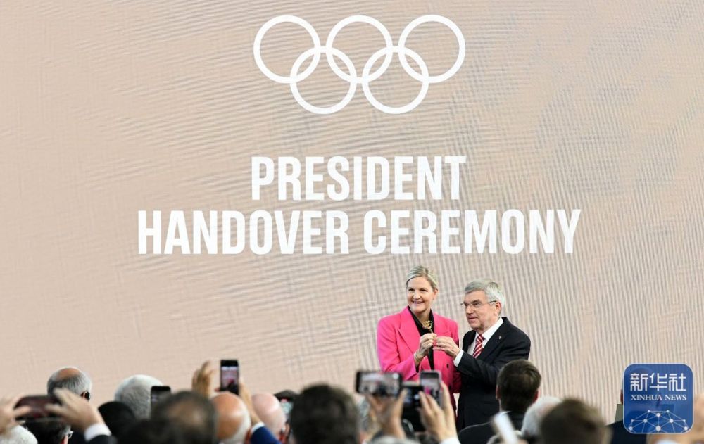 ↑6月23日,巴赫与考文垂(左)在交接仪式上。新华社记者 连漪 摄