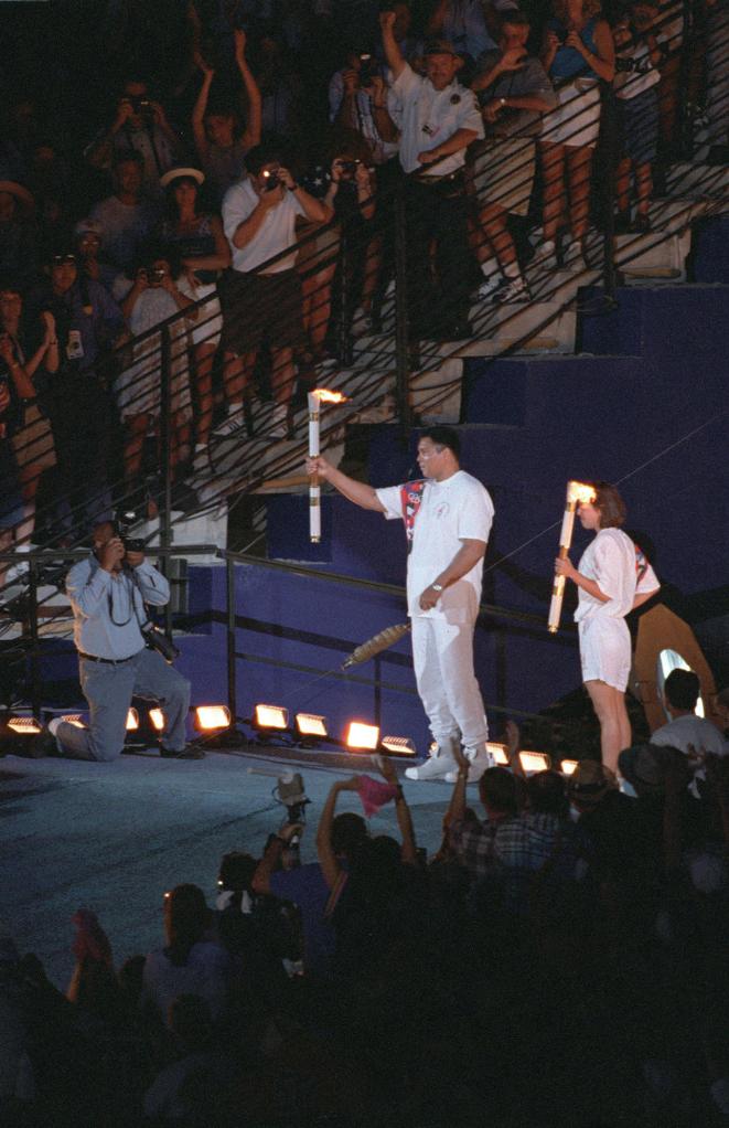 1996年7月19日,第26届奥运会在亚特兰大奥林匹克体育场隆重开幕。前世界重量级拳王阿里点燃第26届奥运会圣火。 新华社记者张燕辉摄(传真照片)
