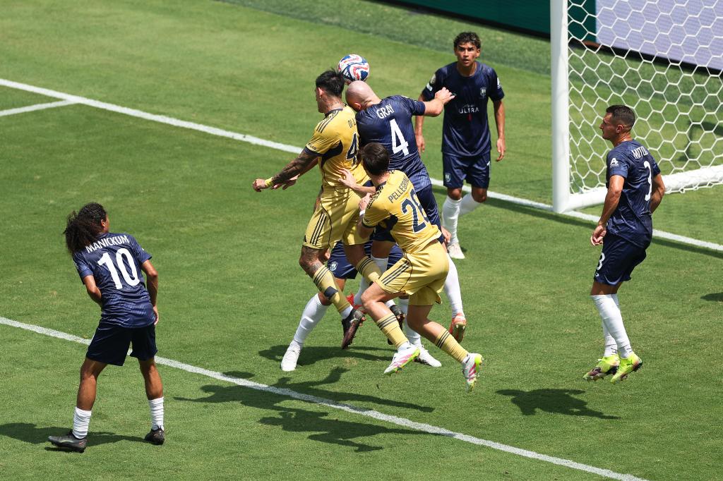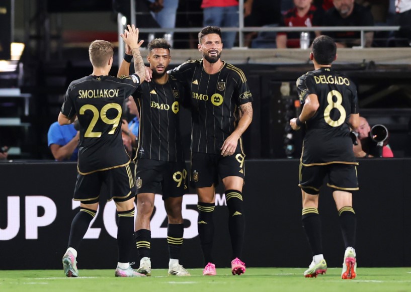 洛杉矶FC队球员布安加(左二)与队友庆祝进球。图片来自国际足联官方图集